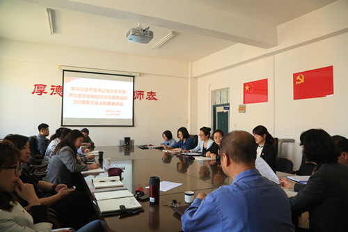 5月9日上午,tyc122cc太阳成集团党总支召开“学习习近平总书记在北京大学师生座谈会和纪念马克思诞辰200周年大会上发表的重要讲话”专题研讨会。会议由党总支书记王丹主持,学院领导班子成员和全体党员教师参加了本次活动。