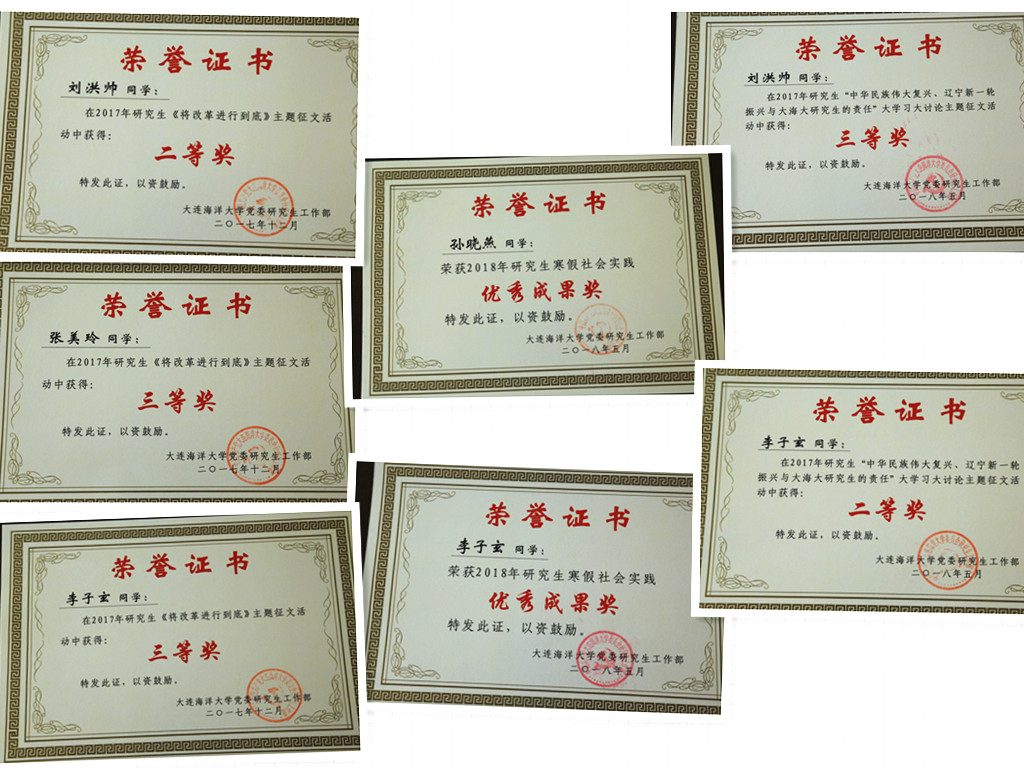 近日,我校研究生院对上半年的征文活动及2018年研究生寒假社会实践进行了评选,我院研究生表现突出,屡创佳绩。其中,刘洪帅、李子玄在《将改革进行到底》主题征文活动中分别荣获二、三等奖;李子玄、刘洪帅、张美玲在“中华民族伟大复兴、辽宁新一轮振兴与大海大研究生的责任”大学习大讨论主题征文活动中分别荣获二等奖、三等奖;李子玄、孙晓燕在2018年研究生寒假社会实践活动中分别荣获“优秀成果奖”。我院也荣获2018年研究生寒假社会实践“优秀组织单位”。