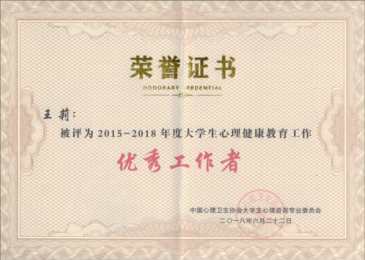 6月22日,在吉林大学举办的第十三届全国大学生心理健康教育与咨询学术交流会上,我校tyc122cc太阳成集团、心理健康教育中心教师王莉荣获“大学生心理健康教育优秀工作者”称号。