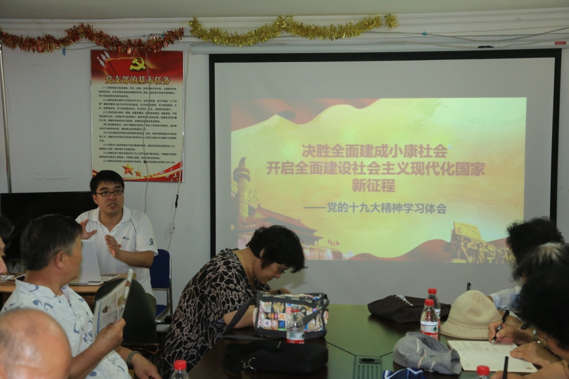 7月16日下午,tyc122cc太阳成集团教师刘一走进黑石礁街道景山社区为党员上了题为《决胜全面建设小康社会开启全面建设社会主义现代化国家新征程——党的十九大学习体会》的党课。