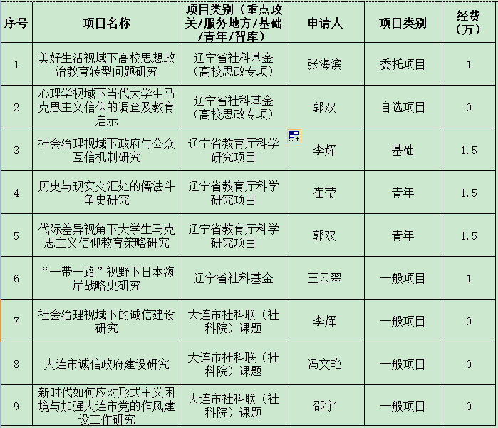 近期,我院获批辽宁省社科基金(高校思政专项)项目2项,辽宁省社科基金项目1项,辽宁省教育厅科学研究项目3项,大连市社科联(社科院)课题3项,具体名单如下: