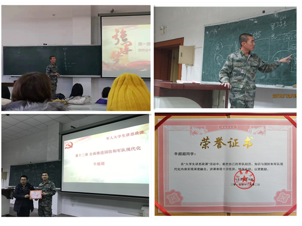 12月5日上午和下午,2017级计算机专业的退役军人大学生辛超超来到“概论”教研室主任李大棚老师的课堂,为同学们讲授了第十二章内容。他结合自身实际,用大量部队训练、生活和学习的事例有针对性地阐释了习近平强军思想和军民融合理论,用自己的品格、气质和感悟感召大学生发奋努力,为实现个人梦和中国梦贡献青春力量。随后,李大棚老师作了点评和总结。同学们纷纷表示收获颇多,感触很深,是一堂有温度有深度的思政课。