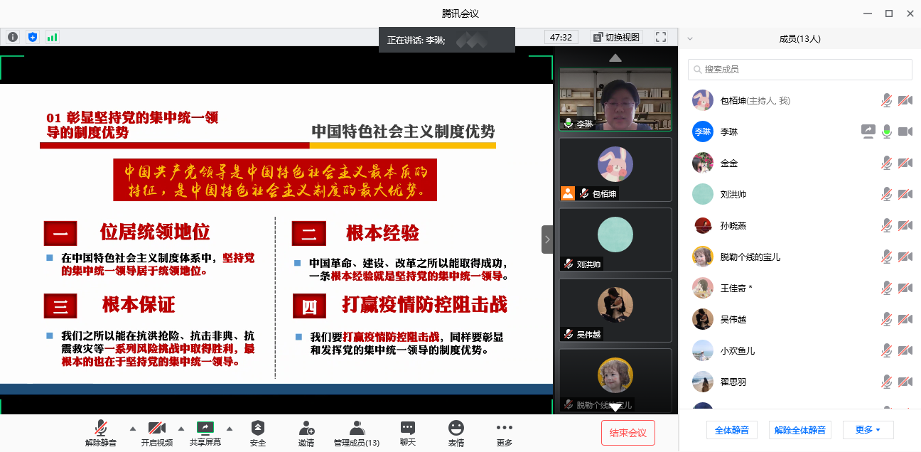 观看结束后,支部书记李琳围绕“在疫情大考中彰显中国特色社会主义制度优势”主题,结合高校党组织战“疫”示范微党课为同学们上了一堂生动的“七一”专题党课。让同学们深刻理解和感受到了我国社会主义制度的优越性,充分认识到坚持党的领导是战胜疫情的根本保证,更加坚定了听党话、跟党走的决心。同时,她指出,学生党员要在这场疫情大考中坚定“四个自信”,要坚持爱党、爱国、爱社会主义相统一,坚持把小我融入大我,发挥党员先锋模范作用。