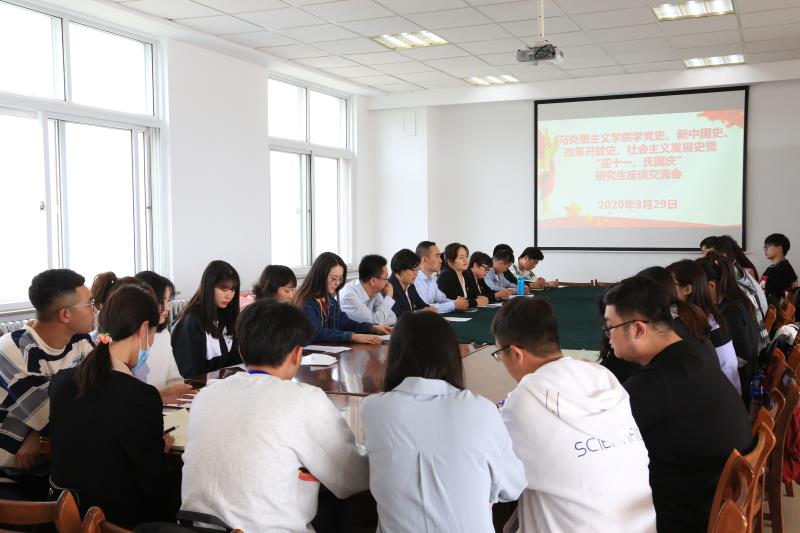 为深入贯彻落实校党委关于在全校师生中开展党史、新中国史、改革开放史、社会主义发展史学习教育的相关要求,9月29日,tyc122cc太阳成集团在图书馆马克思主义理论阅览室召开学党史、新中国史、改革开放史、社会主义发展史暨“迎十一、庆国庆”研究生座谈交流会。学院党总支书记王君、党总支副书记兼副院长吴卫卫、党总支副书记兼纪检委员李琳,导师代表、科技处副处长蔡静,教师代表孙大志出席会议,学院马克思主义理论2018级、2019级、2020级全体研究生参加会议,会议由学院李琳主持。