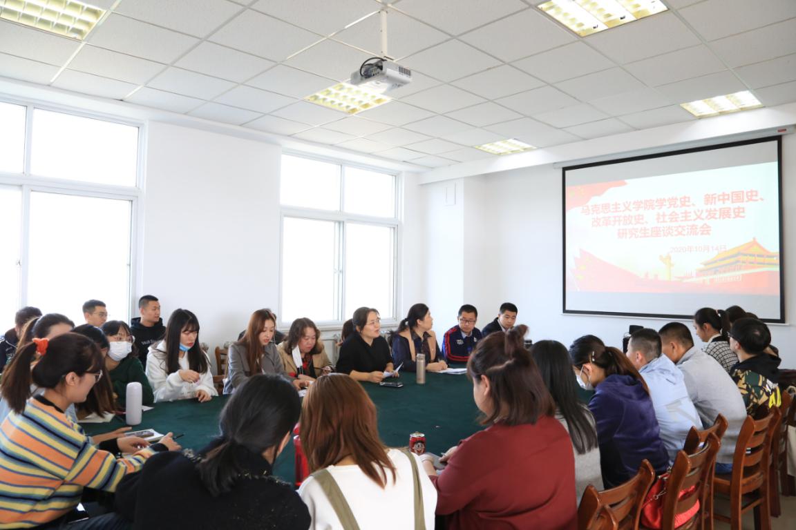 10月14日,tyc122cc太阳成集团在图书馆马克思主义理论阅览室召开“学党史、新中国史、改革开放史、社会主义发展史”研究生座谈交流会。本次会议由党总支副书记兼副院长吴卫卫主持,教师代表马兆俐、李大棚、王云翠及全体研究生参加了本次会议。