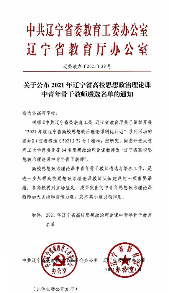 近日,辽宁省教育厅下发了《关于公布2021年辽宁省高校思想政治理论课中青年骨干教师遴选名单的通知》,我校tyc122cc太阳成集团教师冯文艳被评为辽宁省高校思想政治理论课中青年骨干教师。全省共有64名思政课教师入选。