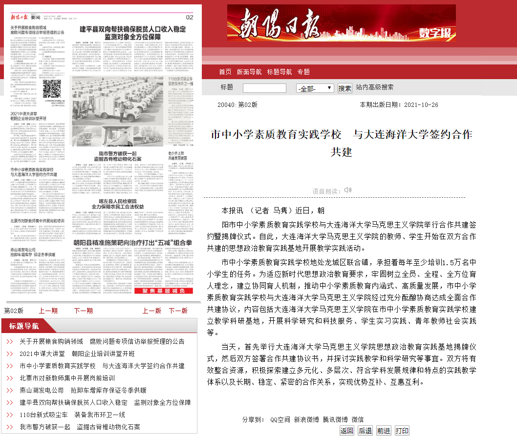 朝阳日报2021年10月26日第二版报道了我校与朝阳市中小学素质教育实践学校签约共建事宜。