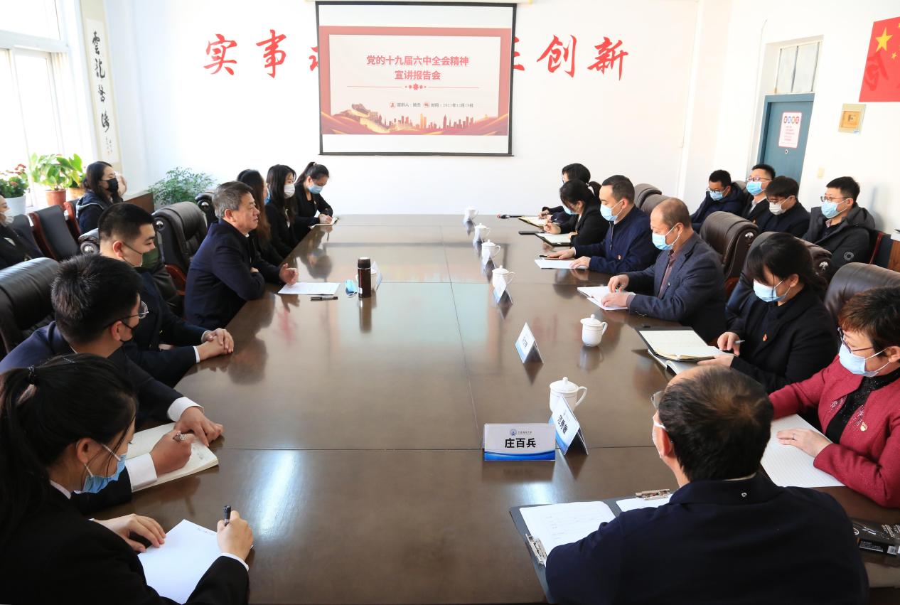 在全校上下深入学习宣传贯彻党的十九届六中全会精神之际,为进一步掀起学习贯彻全会精神热潮,推动学校党史学习教育向纵深发展,12月19日上午,tyc122cc太阳成集团举办了党的十九届六中全会精神专题宣讲报告会,邀请校党委书记姚杰为学院的师生作宣讲报告。