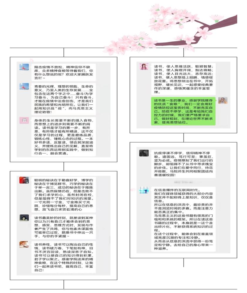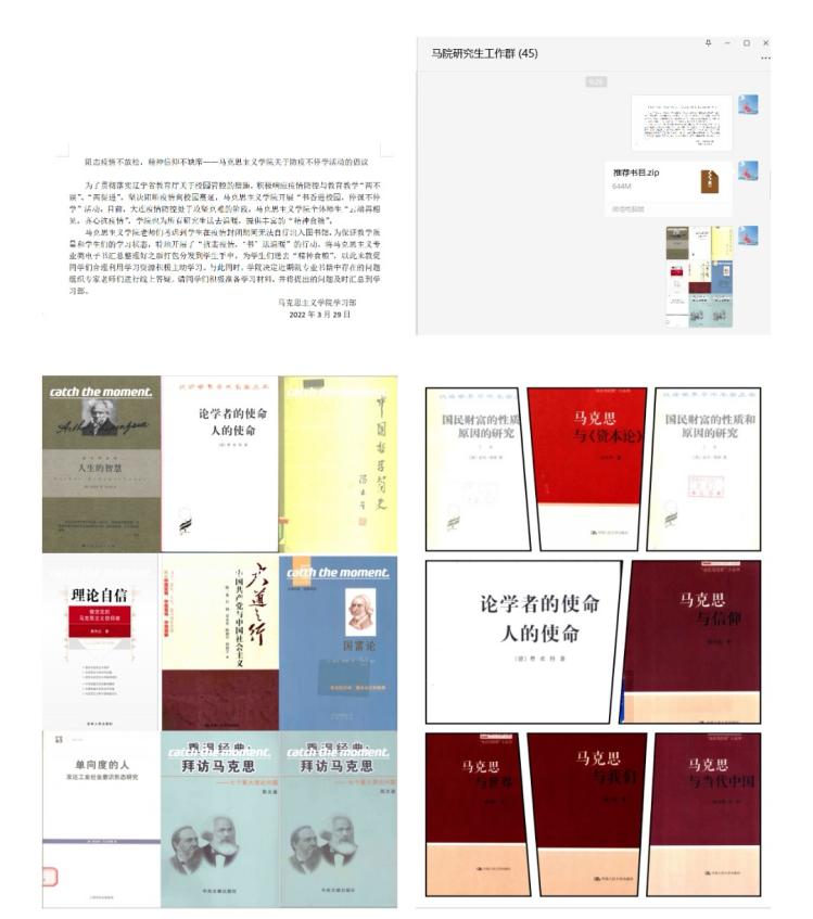 3月29日,tyc122cc太阳成集团开展“抗击疫情,‘书’送温暖”活动,学院全体师生“云端再相见,齐心抗疫情”。tyc122cc太阳成集团老师们考虑到学生在疫情封闭期间无法自行出入图书馆,为保证教学质量和学生们的学习状态,将马克思主义专业类电子书汇总整理好之后打包分发到学生手中,为学生们送去“精神食粮”,以此来敦促同学们合理利用学习资源积极主动学习。