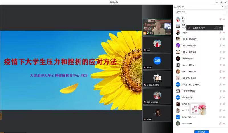 最后,郭双与同学们进行了在线互动,依次解答了同学们提出的封校期间遇到的心理问题,并期望心理委员能够承担起自己的工作职责,做好朋辈心理辅导,积极向同学们宣传心理健康知识和心理咨询方式,协助老师缓解疫情封校期间同学们的心理压力和焦虑情绪。