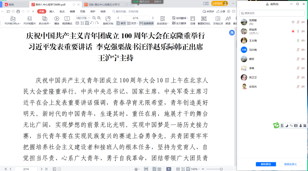会上,以总支委员领学的形式集中学习了“习近平总书记在庆祝中国共产主义青年团成立100周年大会上的重要讲话精神”等专题内容。在研讨交流环节邱金英、郭双分别做了交流发言。