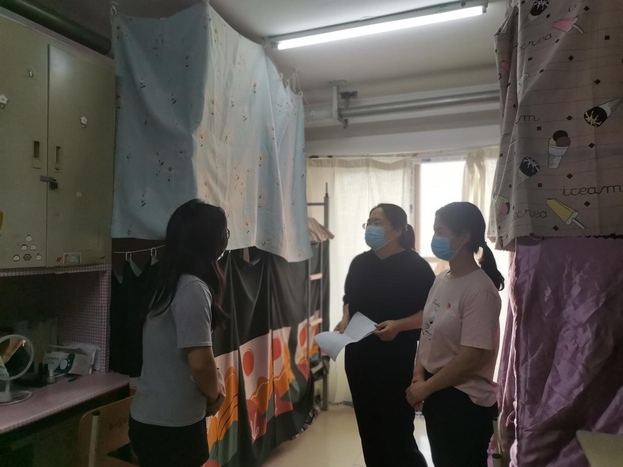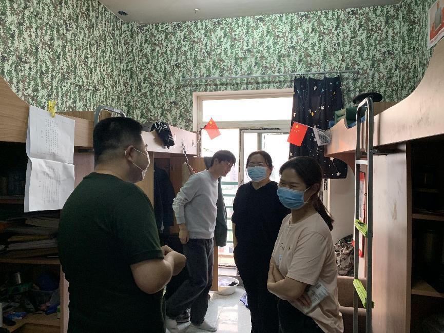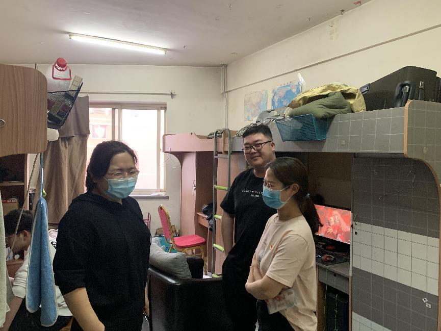 一进公寓,吴书记便在李冬老师的陪同下走访了马院学生的寝室,不同于以往的线上会议的慰问关怀,微信聊天中的嘘寒问暖。这一次吴书记走进寝室,走到学生身边。马院住公寓8人,吴书记走完8个寝室却用了一个多小时,在这一个多小时里吴书记与同学们就疫情防控的生活问题,学习问题及心理情绪问题进行了深入的交流,并嘱咐同学们下楼买饭要戴好口罩,快递包装要当场拆除,注意寝室卫生,勤开窗通风等,充分体出现了吴书记的学生情怀。