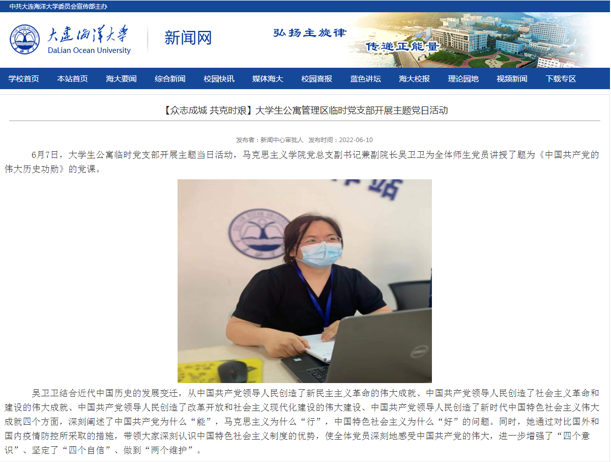 吴书记自入驻公寓,便投身公寓管理区的工作之中。每日3小时安全巡逻以及40分钟的快递点站岗,参与公寓管理区内的夜间寝室巡查和寝室卫生检查,配合研究生院开展离校学生寝室大检查。参与读书分享会并为公寓临时党支部全体师生党员讲授题为《中国共产党的伟大历史功勋》的党课。