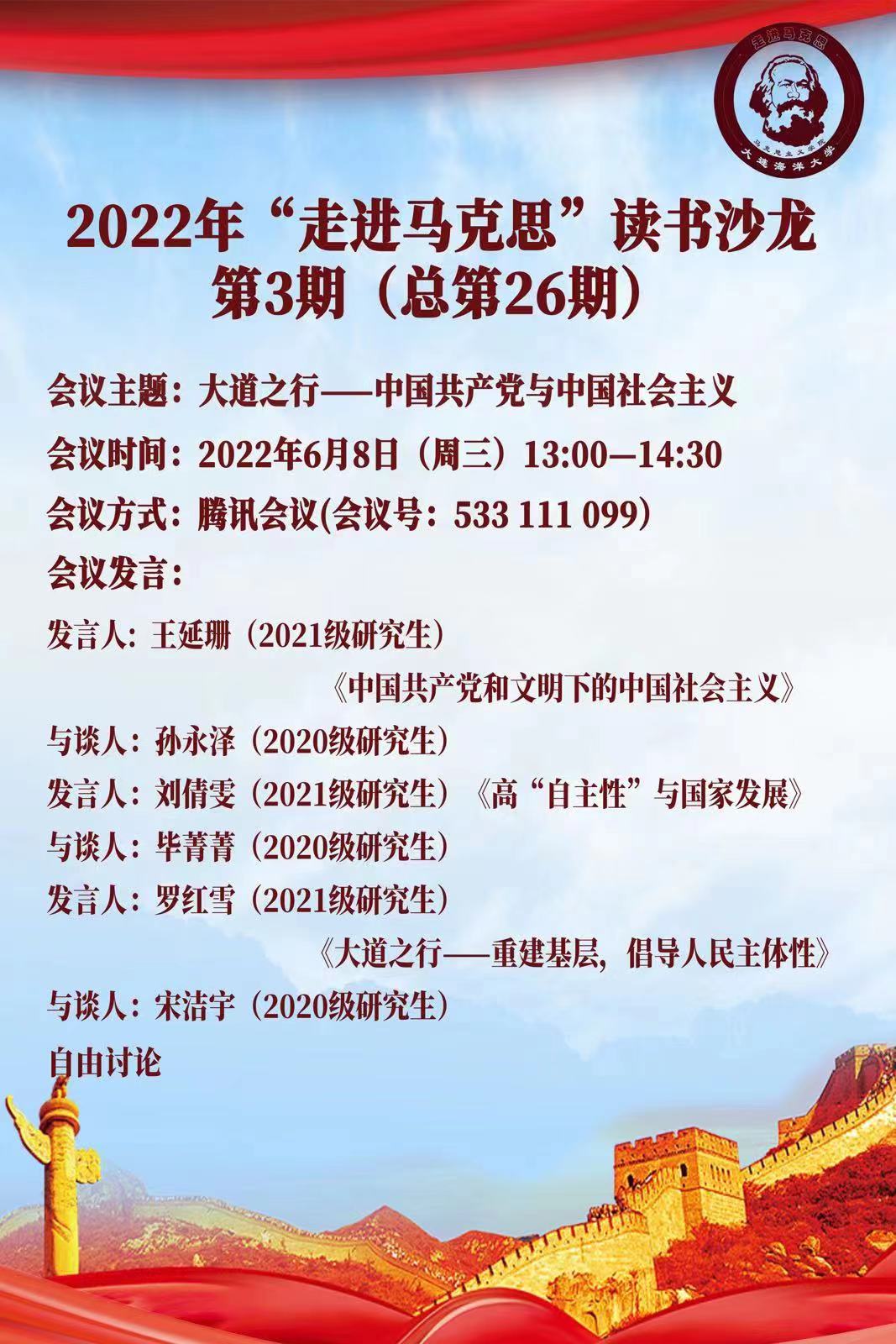 6月8日上午,tyc122cc太阳成集团党总支教工第二党支部和研究生党支部以“走进马克思”线上读书沙龙形式开展6月主题党日活动。活动的主题为“大道之行——中国共产党与中国社会主义”,活动由tyc122cc太阳成集团学生会副主席李茁语主持,教工第二党支部、研究生党支部的全体党员和tyc122cc太阳成集团全体研究生参加了此次活动。
