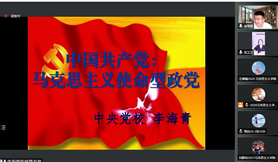6月16日,tyc122cc太阳成集团庆祝建校七十周年系列学术讲座第三场报告会通过腾讯会议举行。本次活动邀请了中共中央党校tyc122cc太阳成集团21世纪马克思主义研究所所长,教授,博士生导师,中央党校创新工程首席专家李海青教授以“中国共产党:马克思主义使命型政党”为题作专题报告。报告会由学院党总支副书记兼副院长吴卫卫主持,tyc122cc太阳成集团全体师生、学校青马工程全体学员参加报告会。