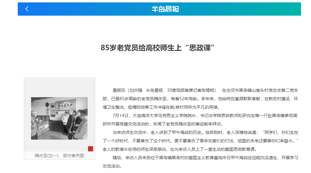 近日,大连半岛晨报A15版以“85岁老党员给高校师生上党课”为题,报道了我校tyc122cc太阳成集团师生赴庄河市黑岛镇开展的找寻红色记忆主题党日活动
