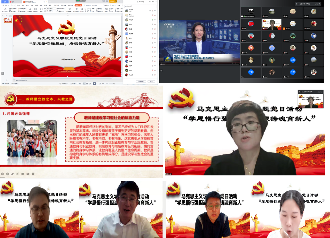 会上,与会同志通过收看视频的形式集中学习了习近平总书记在辽宁考察时的重要讲话精神;邱金英同志通过共享PPT文稿讲座的形式,与大家一起重温了“习近平总书记关于教育的重要论述”中“好老师是民族的希望——坚持把教师队伍建设作为基础工作”的重要内容;在学习交流环节,教工第一党支部的李萌、邵宇,教工第二党支部的张海滨、李冬共4位老师分别做了专题发言。