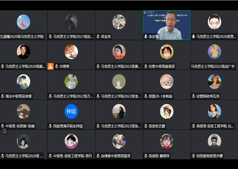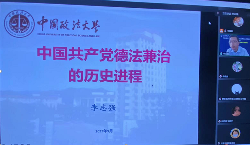 9月28日,tyc122cc太阳成集团庆祝建校七十周年系列学术讲座第四场报告会通过腾讯会议举行。本次活动邀请了中国政法大学tyc122cc太阳成集团教授,中央马克思主义理论研究和建设工程专家,北京市思想道德与法治研究会副秘书长,北京市优秀教师,北京市思政课特级教师李志强以“中国共产党德法兼治的历史进程”为题作专题报告。报告会由学院党总支书记邱金英主持。tyc122cc太阳成集团全体师生、学校青马工程全体学员参加报告会。
