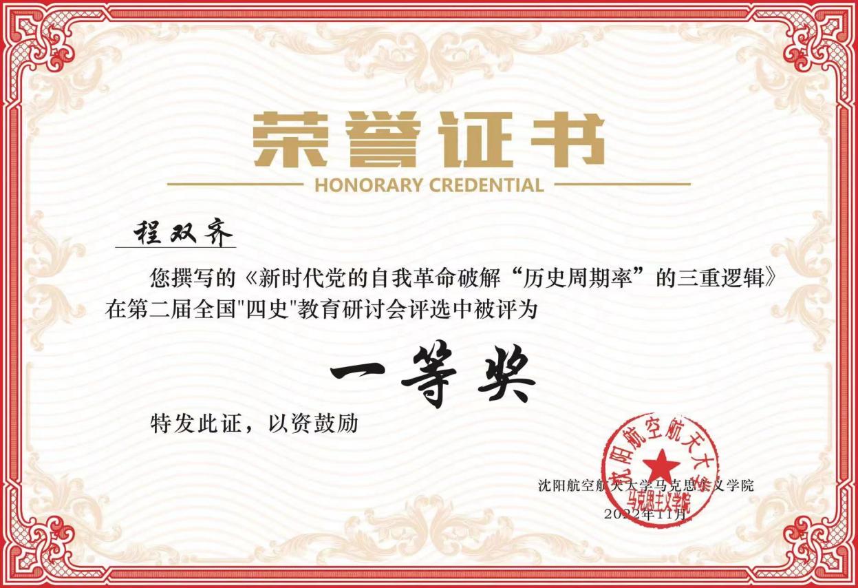 近日,tyc122cc太阳成集团2020级研究生程双齐(指导教师李大棚)撰写的论文《新时代党的自我革命破解“历史周期率”的三重逻辑》,在第二届全国“四史”教育研讨会上获一等奖。