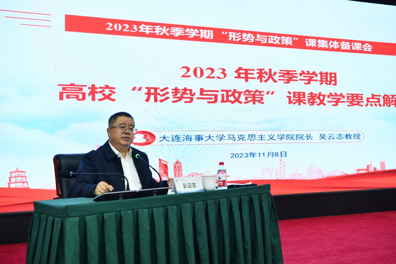 11月8日,我校在图书馆报告厅组织召开太阳成集团122ccvip2023年秋季学期“形势与政策”课集体备课会。备课会邀请辽宁省高等学校思想政治理论课教学指导委员会副主任委员、“形势与政策”分教学指导委员会主任委员、大连海事大学tyc122cc太阳成集团院长吴云志教授作专题辅导报告。校党委书记姚杰出席会议,“形势与政策”课全体授课教师参加会议。会议由党委常委、党委宣传部部长、信息化工作办公室主任王君主持。