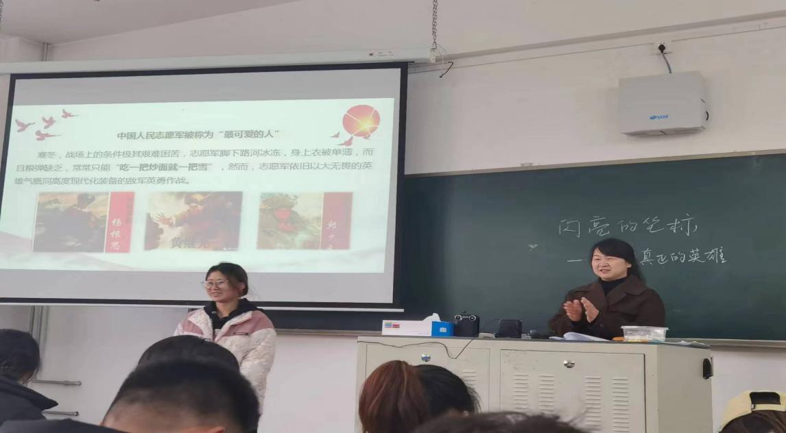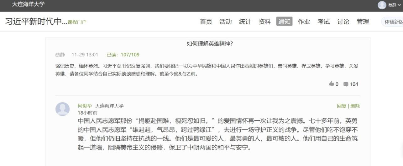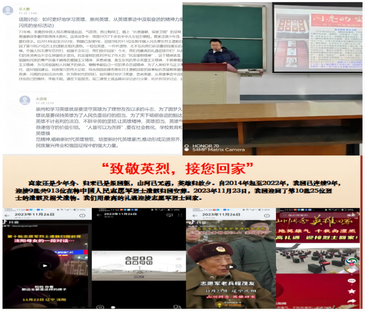 “习近平新时代中国特色社会主义思想概论”课程组教师组织学生观看视频并提前布置讨论任务,通过线上线下开展充分研讨。李大棚老师提前在学习通布置了关于英雄精神的讨论话题,精选精彩评论发布者在课堂上与大家分享,带领同学们探讨新时代大学生如何更好地学习英雄、崇尚英雄、从英雄事迹中汲取奋进的力量。邹素妍老师结合中国近现代史、新中国建设历程和改革开放成就让学生深刻认识到抗美援朝的意义,通过讨论提升了学生的家国情怀。冯文艳老师结合英雄精神思政大课中志愿军战士展现出的英勇顽强的品质和不屈不挠的斗志,引导学生深刻理解“人民是真正的英雄”,从而开展“以人民为中心”的内容讲授。蔡静、李辉、陈曦等教师通过学习通线上研讨和课堂讨论等方式鼓励学生抒发感想,同学们各抒己见,讨论热烈。