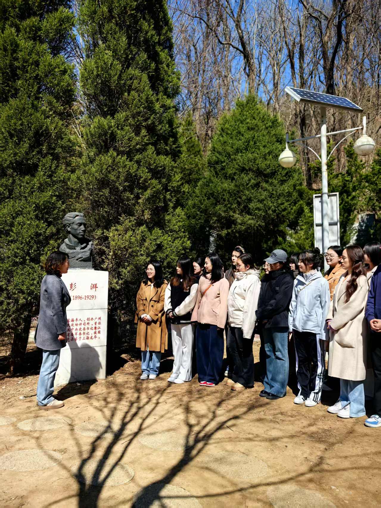 辅导员沈文静为大家讲述李大钊、澎湃等革命先烈的英勇事迹,激励着每一位参与者,进一步强调了革命精神的时代价值,并开展现场教学,研究生代表分别发言,结合自身学习经历,分享对革命文化的理解和感悟。活动最后,大家纷纷为革命烈士敬献鲜花,表达对先烈的深切缅怀和崇高敬意。