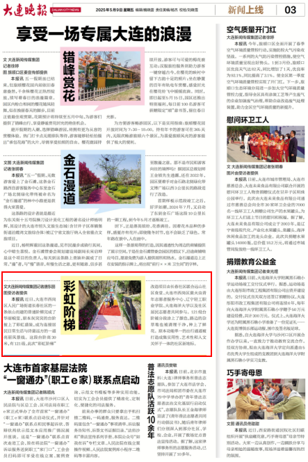5月9日,大连晚报以“彩虹阶梯”为题报道了我校tyc122cc太阳成集团“红绿蓝”小海星研究生志愿服务队队员参加大连市西岗区人民广场街道长春社区的美化社区志愿服务活动。