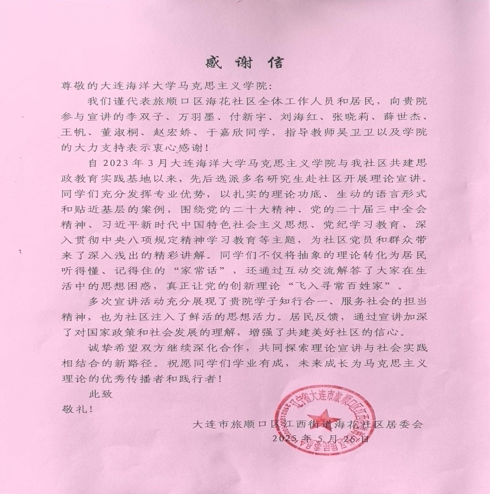 近日,大连市旅顺口区江西街道海花社区向马克思主义学院发来感谢信,信中对我院积极选派研究生赴社区开展理论宣讲表示诚挚感谢。