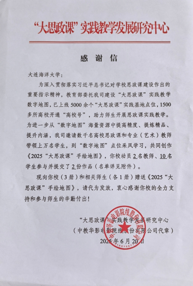近日,“大思政课”实践教学发展研究中心致函我校,对我校tyc122cc太阳成集团、海洋法律与人文学院师生在深度参与教育部委托建设的“大思政课”实践教学数字地图创作和《2025“大思政课”手绘地图》编撰中的辛勤付出,致以诚挚感谢。