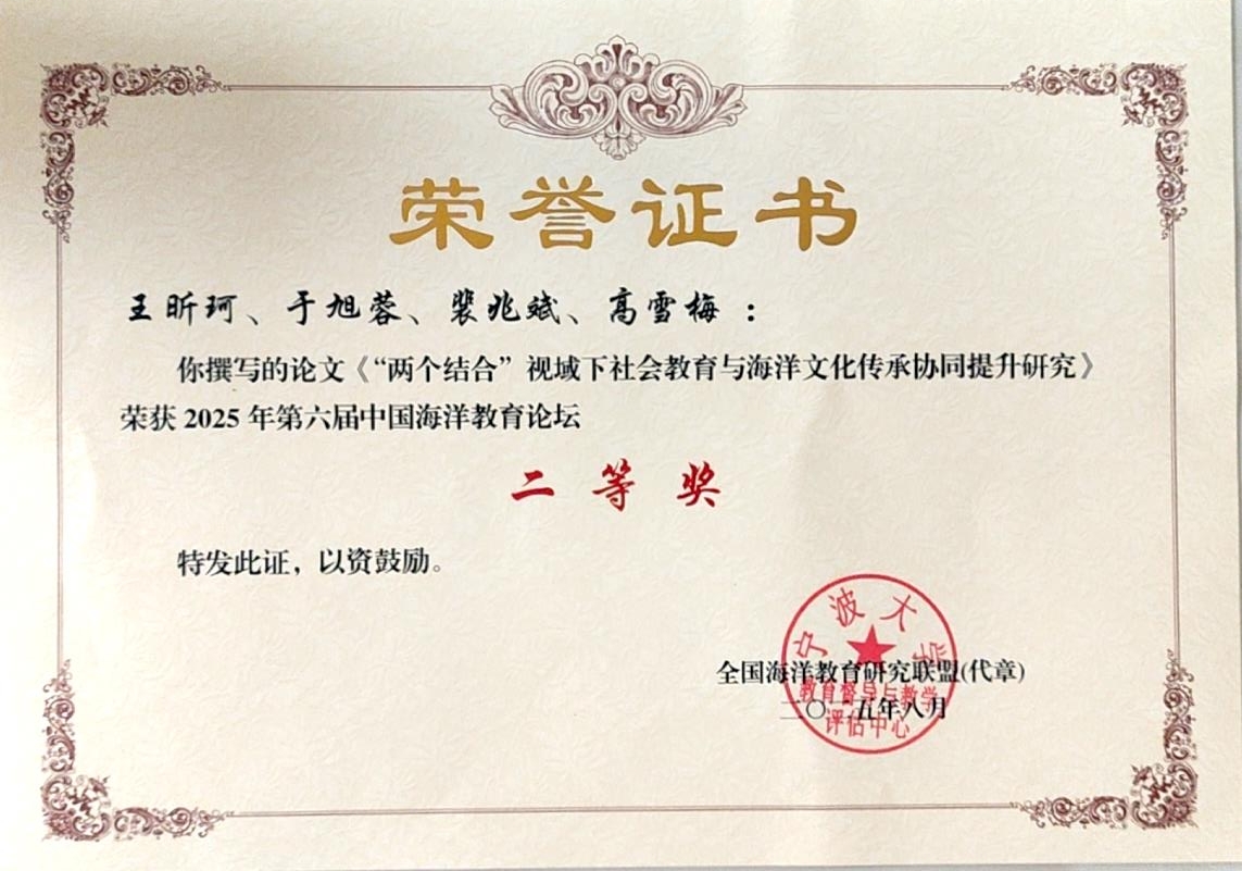以王昕珂为第一作者、于旭蓉为指导教师撰写的《“两个结合”视域下社会教育与海洋文化传承协同提升研究》一文,在本次论坛论文评选中荣获二等奖。