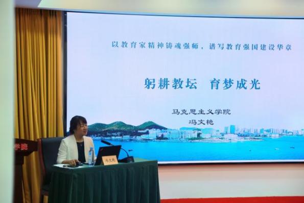 在“讲述我的育人故事”环节中,由辽宁省普通高等学校本科教学名师获得者蔡静教授和冯文艳教授分别作了主题分享。蔡静教授以“以教育家精神为炬,点亮青年逐梦之路”为题,从“深耕理论之维—在‘知’的层面上,让学生‘真懂真信’”“厚植情怀之维—在‘情’的层面上,让学生‘同心同德’”“锤炼实践之维—在‘行’的层面上,让学生‘知行合一’”三个方面展开讲述。她结合自身多年教学实践,阐述了教育工作中对知识的追求、对学生的情感关怀以及将理论付诸实践、培养学生综合素养的重要性。蔡静教授深情回顾了自己与学生共同成长的经历,强调教育不仅是知识传授,更是心灵的陪伴与人格的塑造,彰显了教育工作者的专业素养与育人情怀。冯文艳教授以“躬耕教坛 育梦成光”为题,从“致敬:师者如光提灯引路”“践行:躬耕教坛笃行不怠”“期冀:教育家精神指引前行”三方面分享了她的育人故事。在这特殊的日子里,她从点滴故事着眼,首先致敬前辈、致敬恩师、致敬“大先生”。随后,她讲述了自己19年来坚守育人初心、躬耕教坛的探索和体会,倡导大家以教育家精神为指引,共同谱写教育强国建设新篇章。