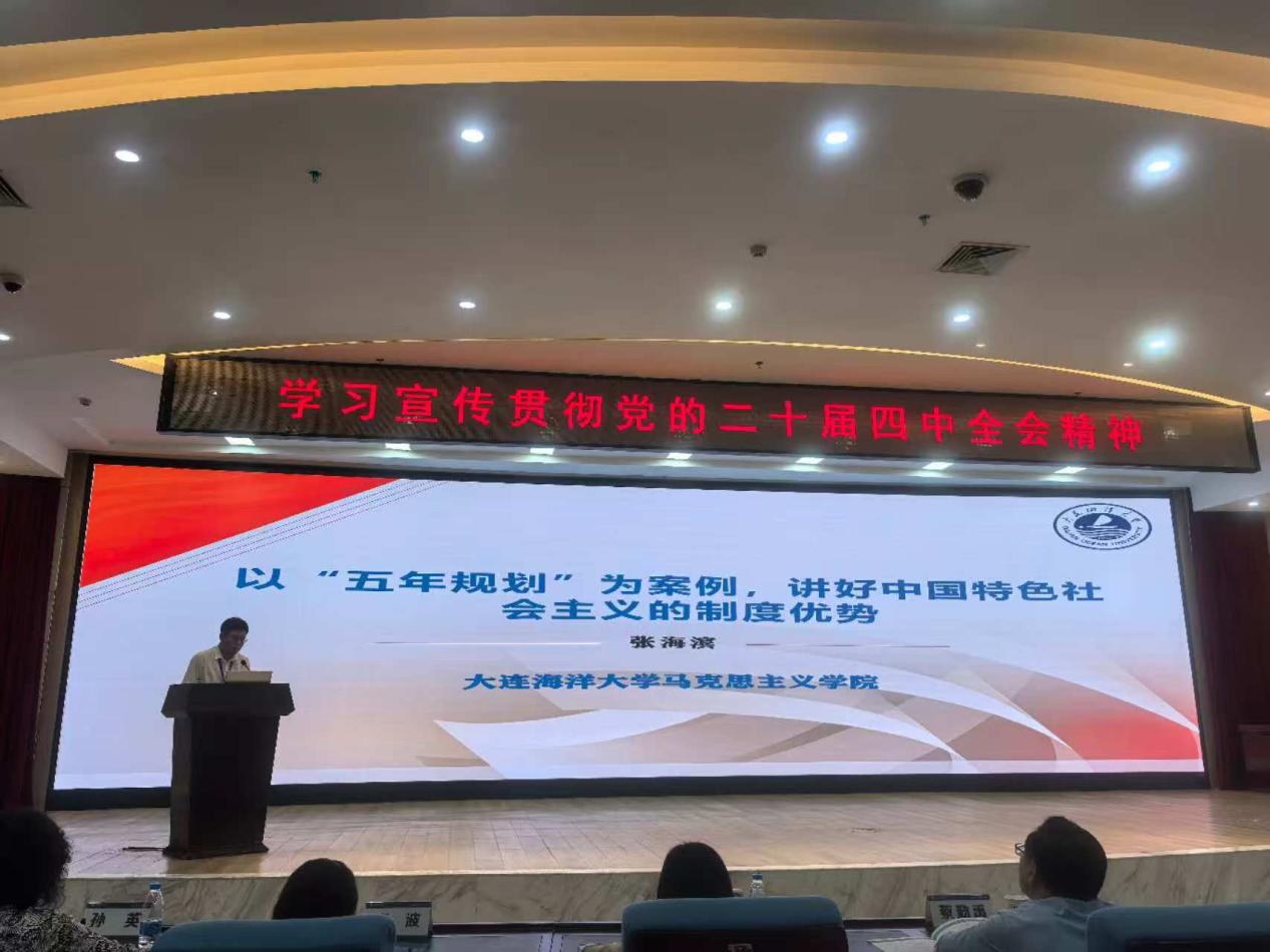 主旨报告和主题发言环节,来自中央民族大学的孙英教授作题目为“党的二十届四中全会精神融入高校思政课教学”的主旨报告,来自全国涉海高校联盟的11位tyc122cc太阳成集团院长、学科负责人、教研室主任先后作主题发言,我院张海滨老师在主题发言环节以“以五年规划为案例 讲好中国特色社会主义制度优势”为题进行了交流发言。